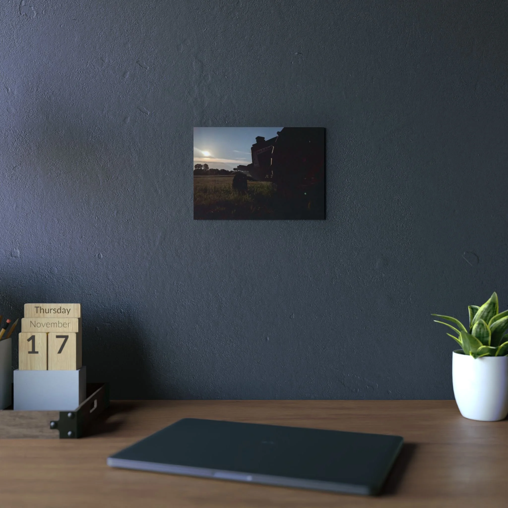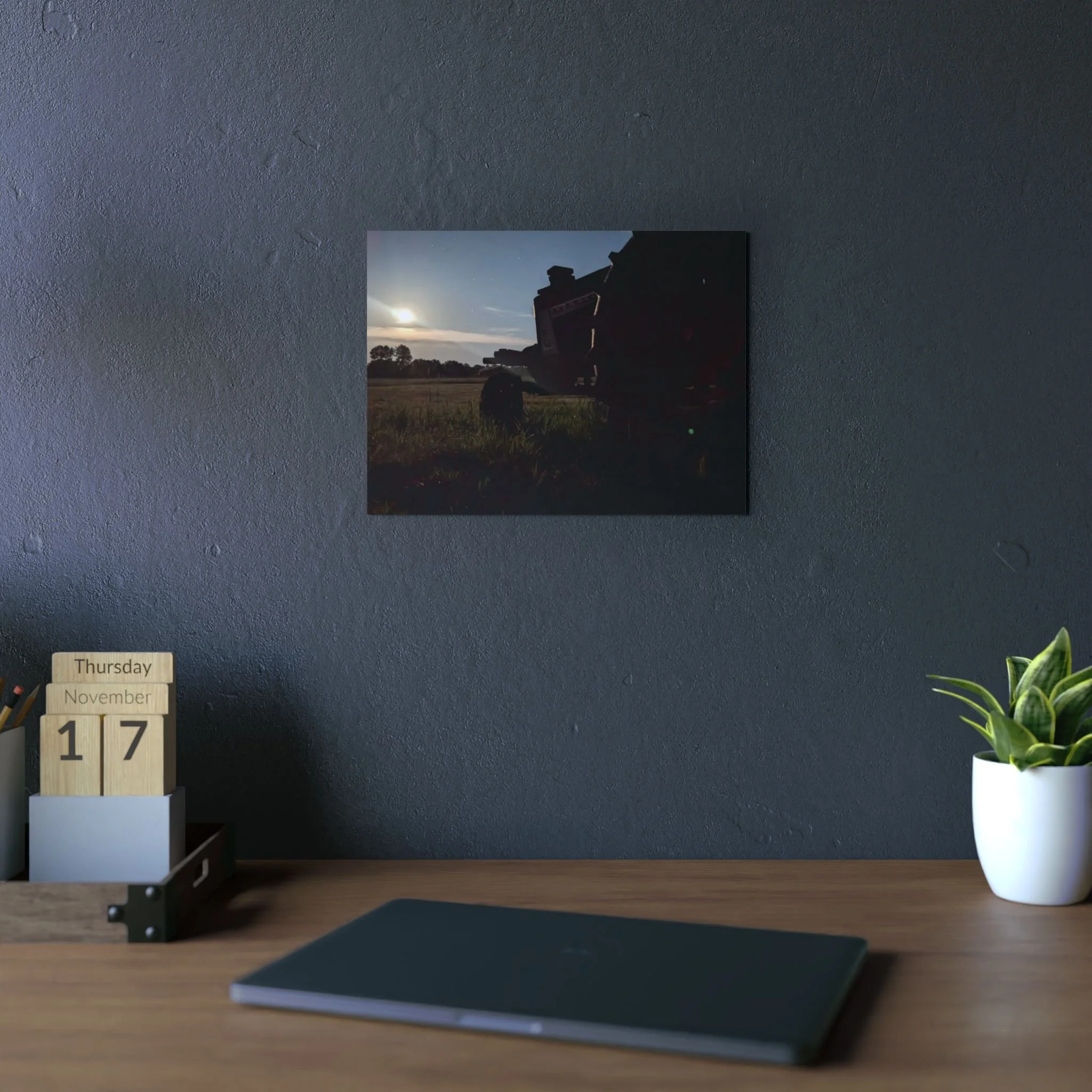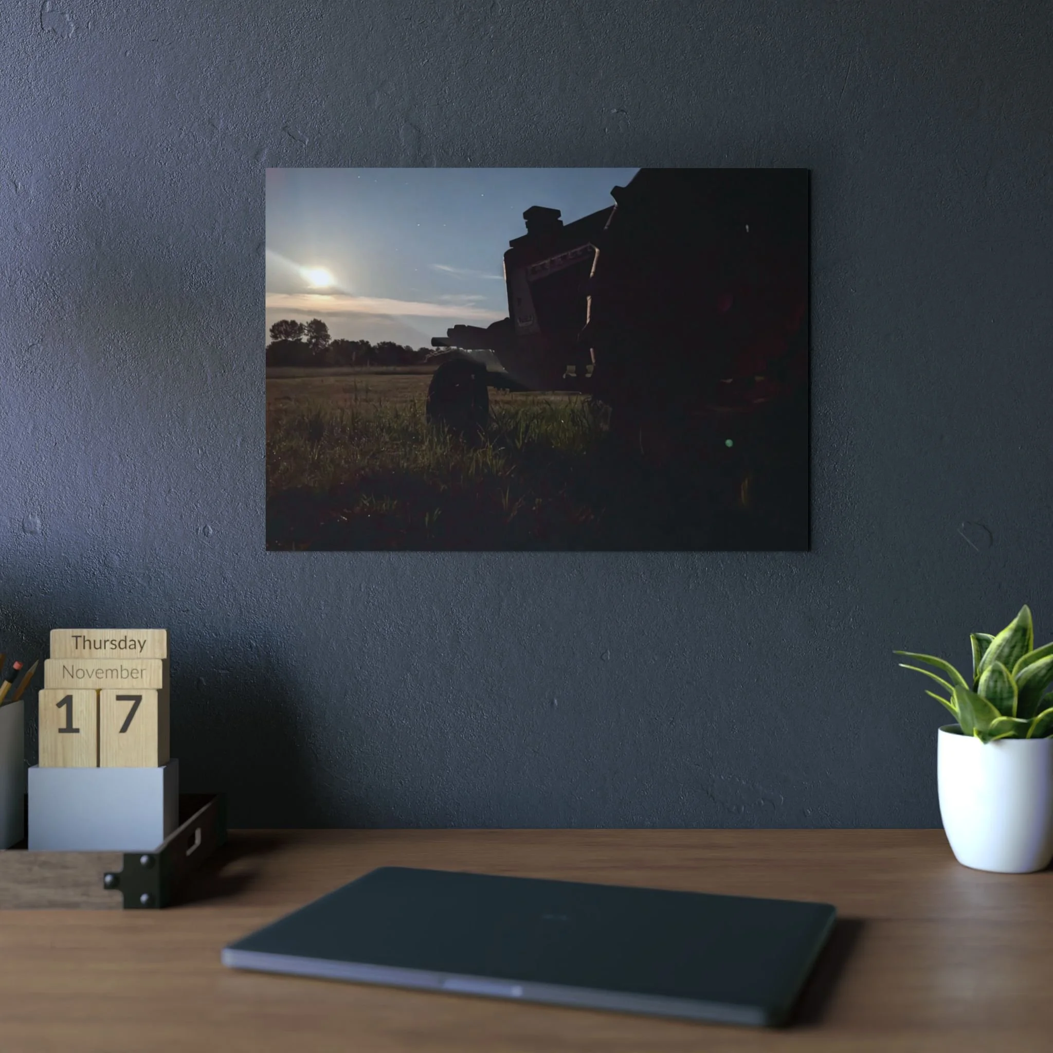 A lightweight, weather-ready wall panel that keeps the moody depth and rich contrast of your photograph intact. The image — a low-slung sunset behind farm equipment — comes through with vivid, crisp tones on a slim 3mm aluminum face that resists scratches, sun fade, and moisture. Each panel arrives with pre-mounted hanging hardware and bumpers, so it hangs flat against drywall or outside siding and holds steady whether placed horizontally or vertically. The matte finish tames glare so the scene reads well in dim home offices, entryways, or on a covered porch, preserving that late-evening hush wherever you display it.