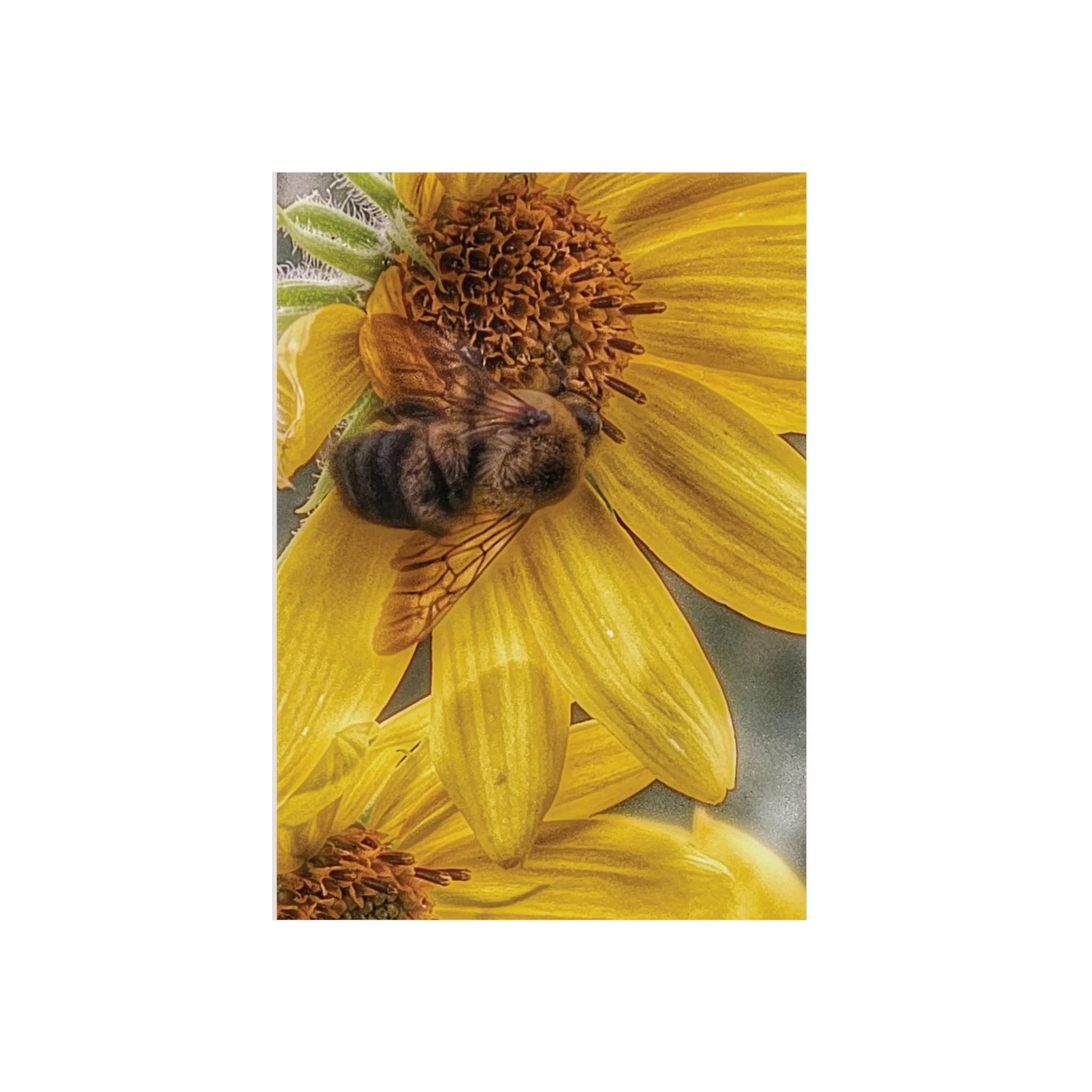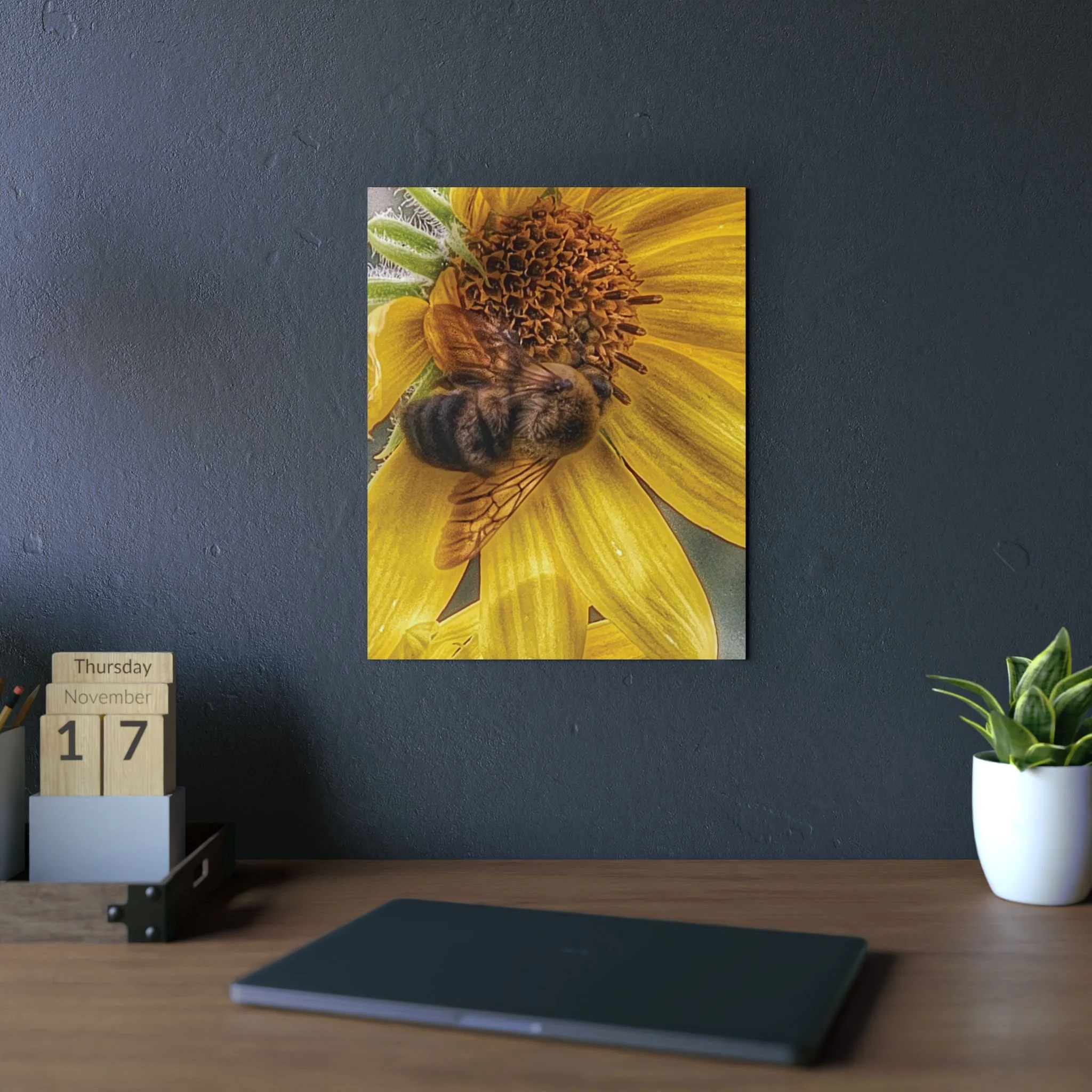 A luminous aluminum panel that captures the quiet drama of a bee at work on a sunlit sunflower. The matte finish softens glare while preserving vivid yellows and warm ochres, so the image reads beautifully from across a room or close at hand. Lightweight yet rigid, the 3mm composite sits flush to the wall with pre-mounted hanging hardware and protective bumpons for a stable, bump-free display. Weatherproof and scratch-resistant, it moves easily from a bright kitchen or home office to a covered porch or garden room without losing color or detail.