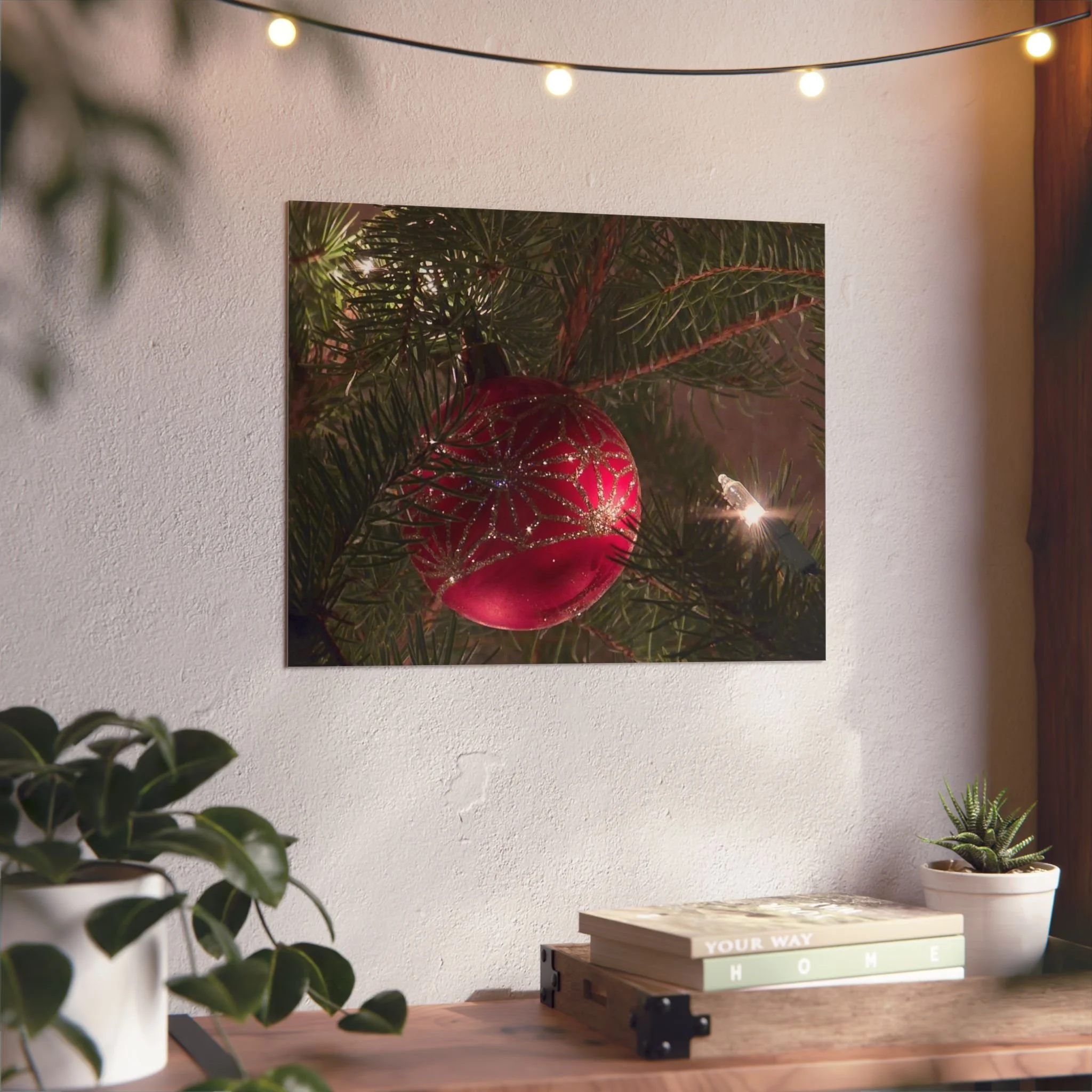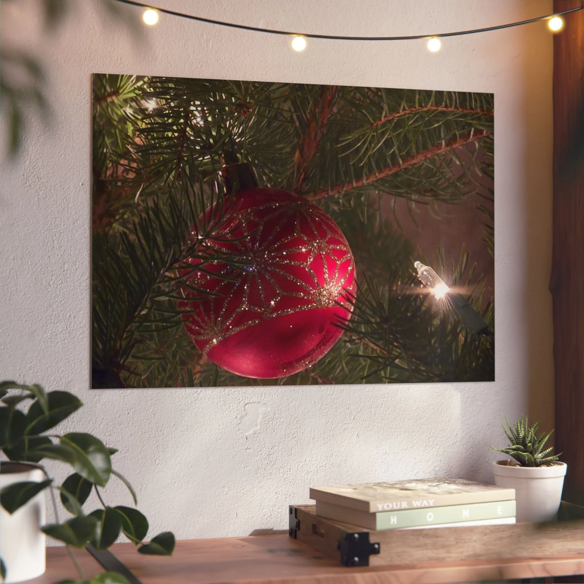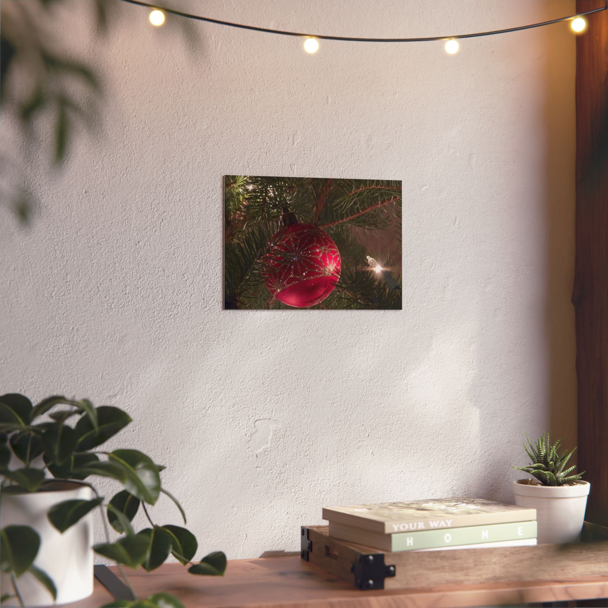 A 3mm aluminum composite print that captures a quiet, warm holiday moment — a red glass ornament caught in soft tree light. The matte surface mutes glare and gives the image a painterly depth, while the solid aluminum construction keeps the piece lightweight and warp-free for years. It arrives ready to hang with pre-mounted hardware and protective bumpons, so you can place it on a cozy entry wall, above a desk, or on an outdoor-covered porch without fuss. Colors stay vivid thanks to modern printing methods, and the sturdy black PE core with aluminum faces makes this a resilient, weather-tolerant wall accent that holds up in seasonal displays and everyday decor alike.