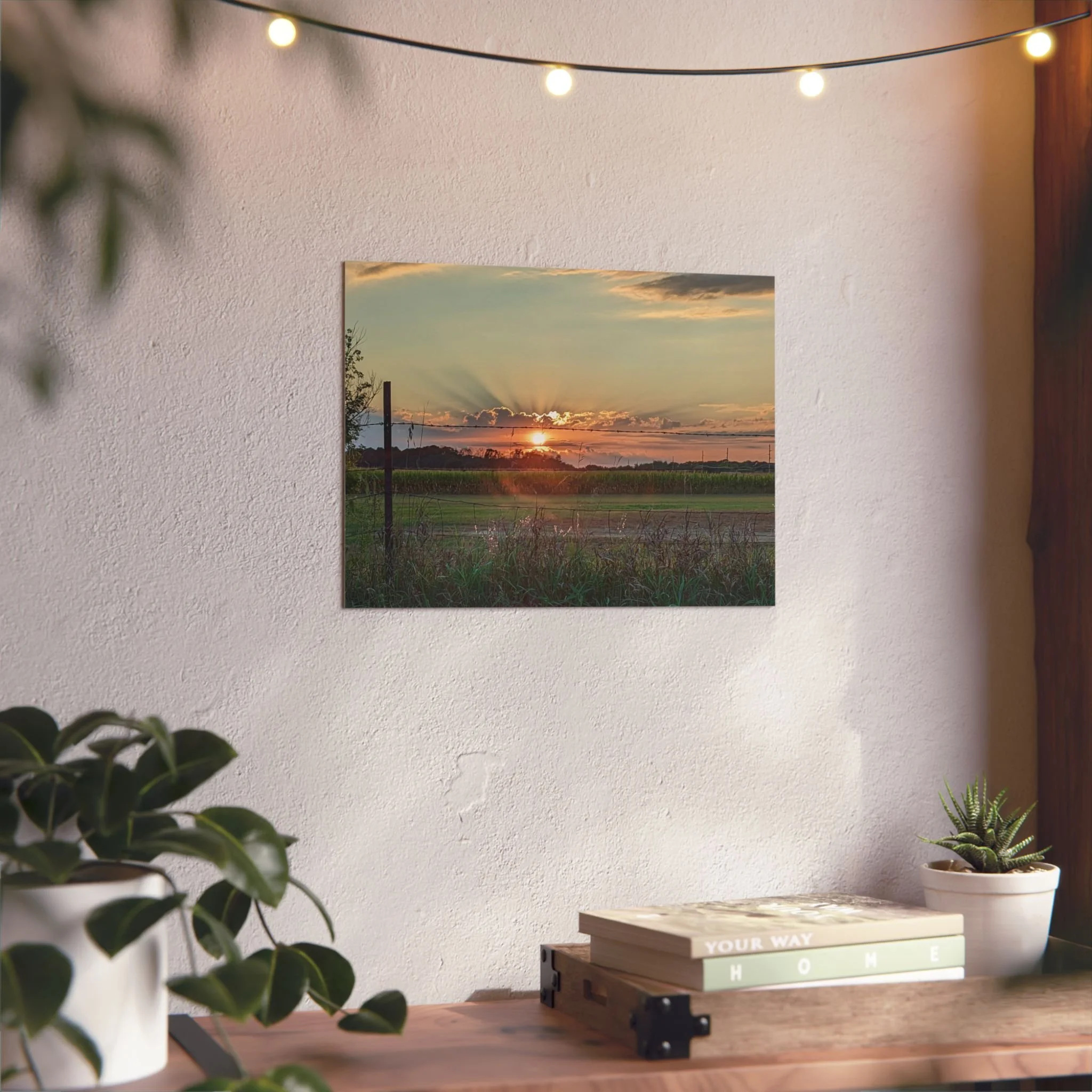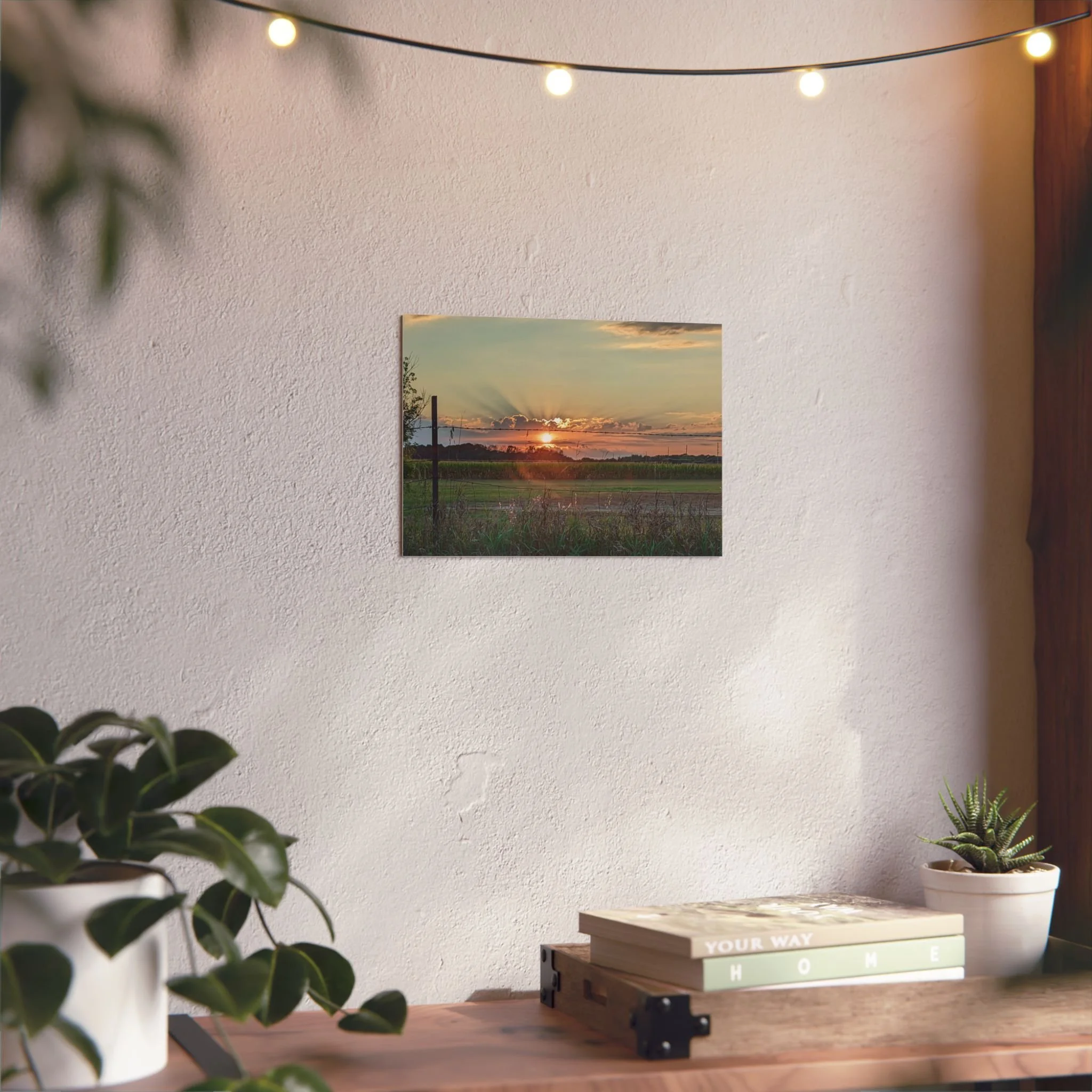 A slim, weather-ready aluminum panel. The matte surface tames glare so the soft rays and warm horizon read like a memory instead of a photograph. Lightweight but sturdy, it hangs straight from the pre-mounted metal hanger and the bumpons keep it steady against the wall — an easy way to bring a quiet, rural evening into a home office, hallway, or covered porch. Colors stay true outdoors thanks to UV-resistant inks, and the 3mm composite core keeps the piece rigid without feeling bulky. Choose a size that fits your wall and enjoy the sunset no matter what time of day.